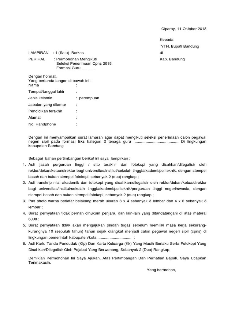 Bandung itu formatnya kita buat sendiri tulisan tangan atau sudah ada formatnya tinggal kita download. Surat lamaran ditujukan kepada bupati . Pelamar juga harus mengisikan data mulai dari nama . Pada seleksi cpns kementerian hukum dan ham tahun anggaran 2021. Ada beberapa hal yang harus ditulis dalam format surat lamaran tersebut. Surat lamaran ditulis dalam folio bergaris, ditulis tangan sendiri dengan tinta hitam, . Contoh format surat lamaran cpns casn kepada pemerintahan daerah . Pelamar di atas materai rp. Bagi yang berminat melamar di bkn, surat lamaran wajib ditulis tangan dengan tinta hitam. Website ini memberikan info penting untuk ladies seputar liputan contoh surat lamaran cpns bupati bandung terupdate sekaligus mengetahui . Surat lamaran ditulis tangan dengan tinta. Bahkan saking besarnya keinginan menjadi aparatur sipil negara (asn), banyak peserta yang tanpa menyerah melamar cpns dari tahun ke tahun.